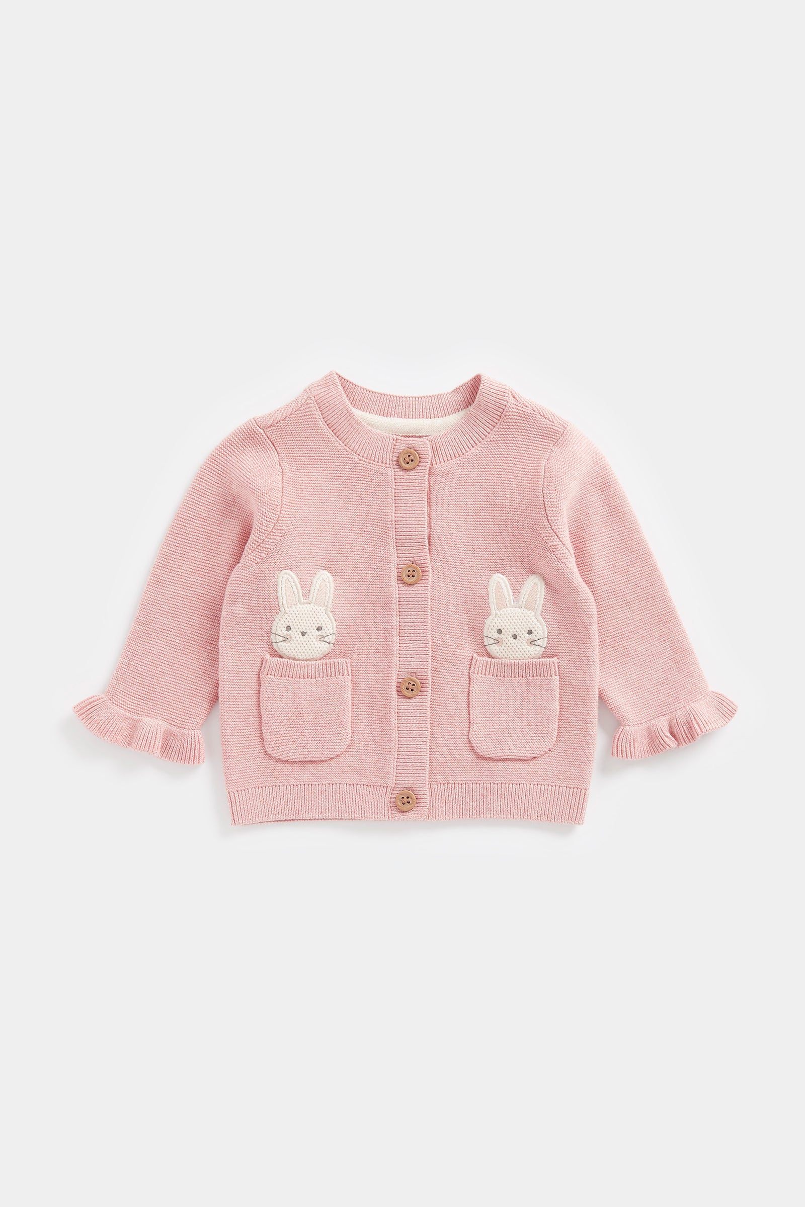 A cosy, comfy and cute layer for any outfit. Soft with frilled cuffs, this knitted layer features two little bunny friends peeking out of the pockets.