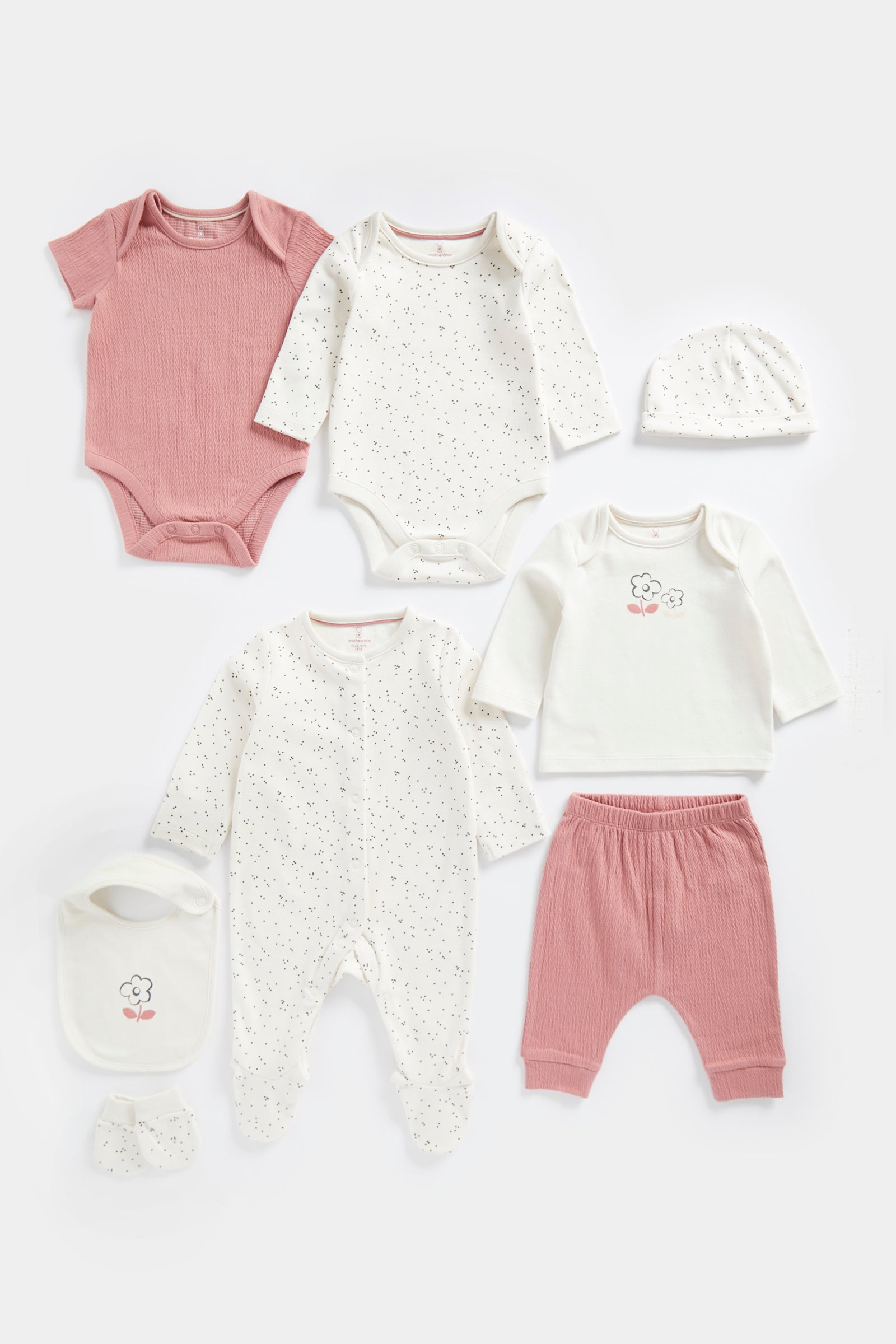 - Includes: 2 x bodysuit 1 x sleepsuit 1 x T-shirt 1 x joggers 1 x bib 1 x hat 1 x pair of mittens