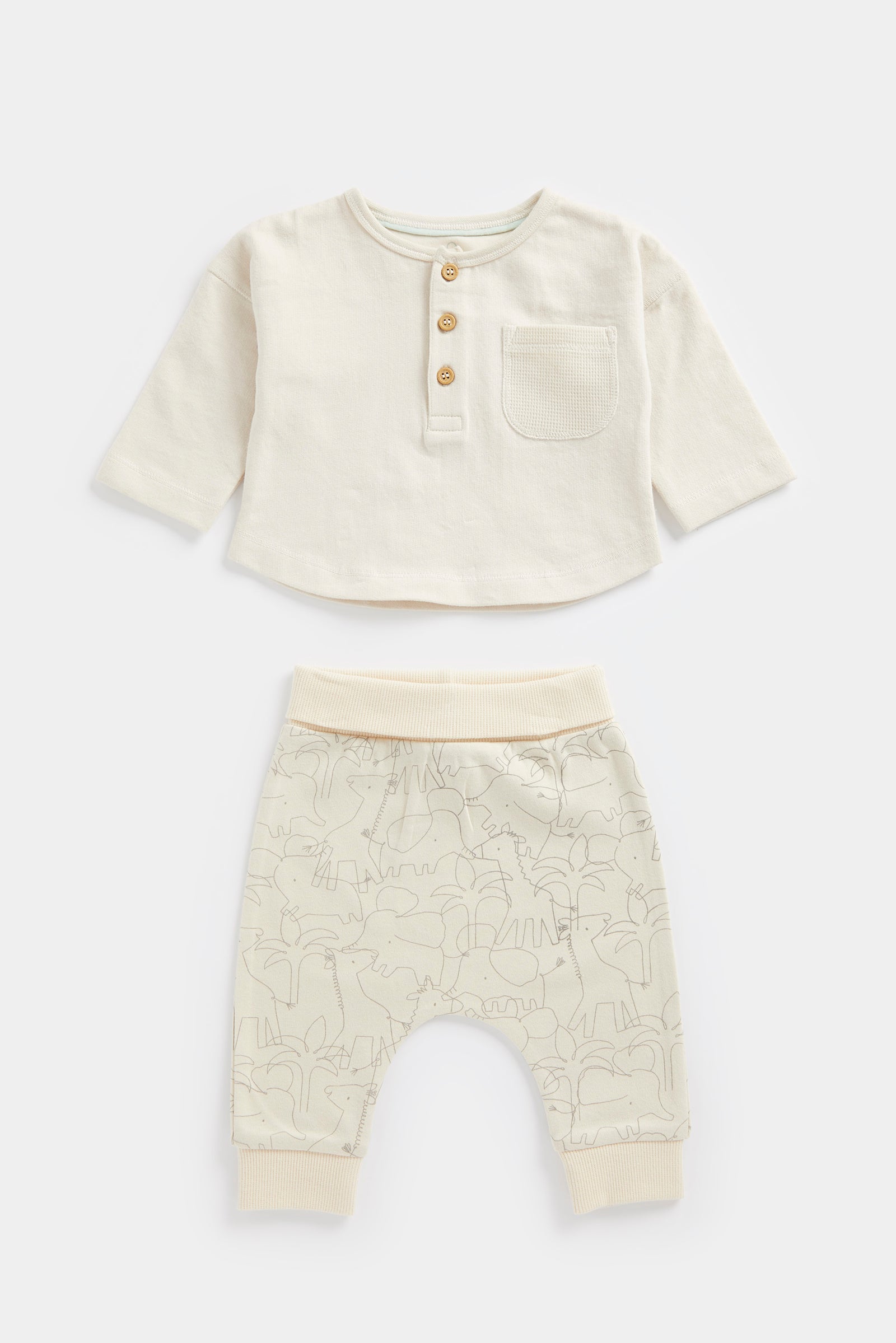 In natural colours with gentle prints and textures, this coordinating two-piece outfit set is crafted from naturally breathable cotton which is kind to young skin. The roll-up waistband allows you to adjust the length of the joggers as baby grows.